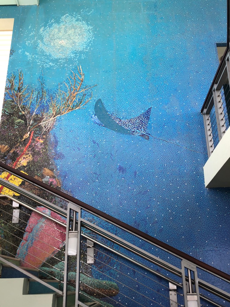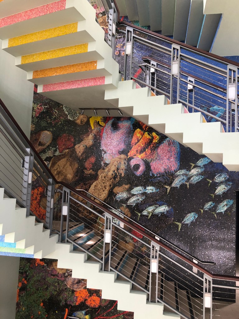 There’s a large Whole Foods-like supermarket, liquor store, Starbucks, restaurants, movie theater, and shops here. They also have a free 75-foot observation tower with beautiful mosaics and a small marina if you need to kill time.