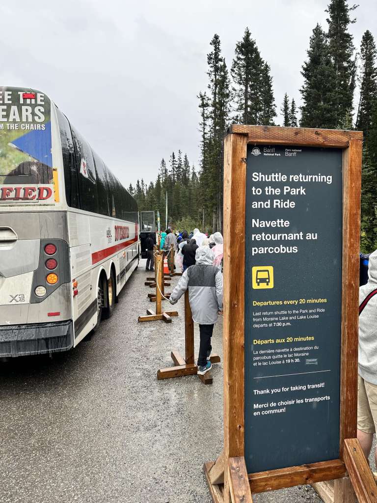 The ride from Park & Ride to Lake Louise is about 15 minutes, and the ride to Moraine Lake is about 25 minutes.