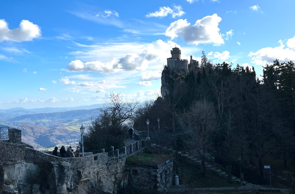 - Third Tower (Montale) – The third tower is the only one not open to the public, but you can still walk around its base for beautiful views of the surrounding San Marino landscape and the distant coastal city of Rimini. It’s about a 7-minute walk from the second tower, and another 7 minutes down to the parking area behind the Centro Congressi Kursaal. On the way down, you’ll pass by another lovely scenic view of San Marino.